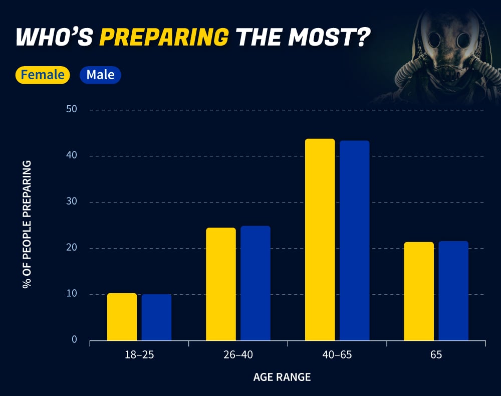 Men and women in the 40-65 age group were found to be the highest proportion of doomsday preppers, whereas the younger generation, both men and women aged 18-25, were least likely to have a doomsday plan.