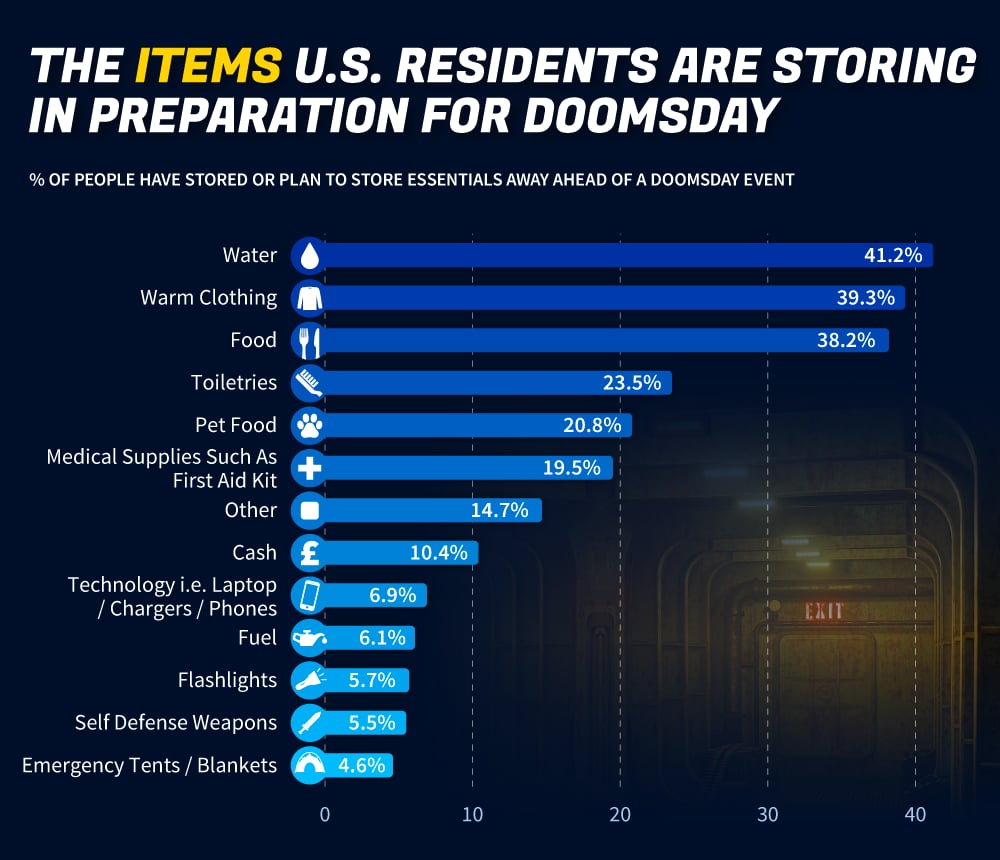 Water and warm clothing came out on top, with 41.2% and 39.3% of respondents, respectively, choosing these items as the most important to store in preparation for doomsday.