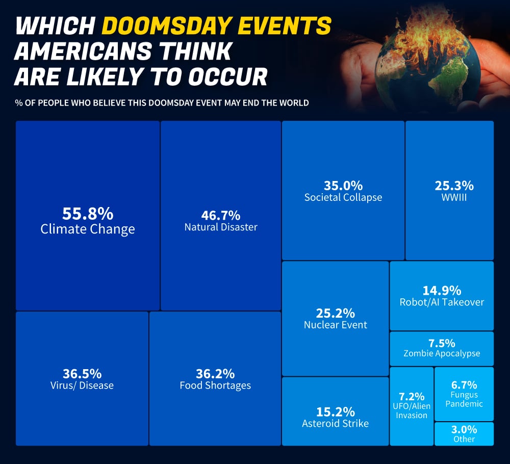 Food shortages and societal collapse are believed to be the fourth and fifth most likely doomsday events, according to 36.2% and 35% of respondents, respectively.