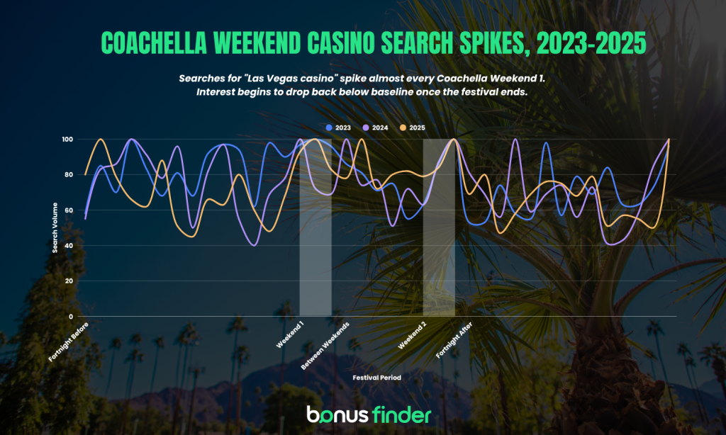 BonusFinder analyzed daily Google Trends data for the search terms 'Las Vegas', 'las vegas casino', and 'hotels las vegas' across the Coachella festival period for 2023, 2024, and 2025. Each term was queried independently to ensure accurate indexing, with the geographic filter set to the United States. Results were segmented into five periods: the fortnight before Coachella Weekend 1 (used as the baseline), Weekend 1, the between-weekends window, Weekend 2, and the fortnight after. Percentage changes were calculated against the pre-festival baseline.