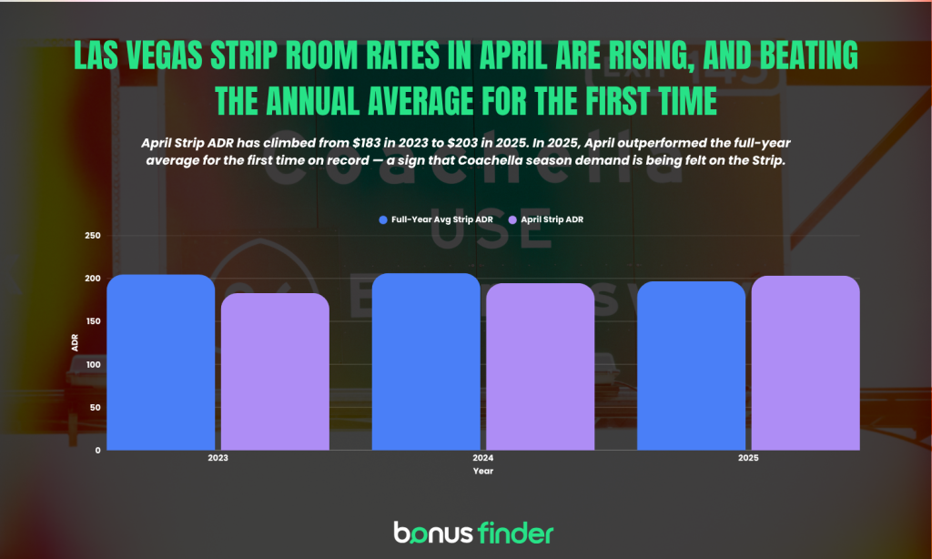 The Las Vegas Strip Average Daily Room Rate (ADR) in April has risen from $183 in 2023 to $194 in 2024 to $203 in 2025 — an 11% increase over three years, in the month Coachella takes place.